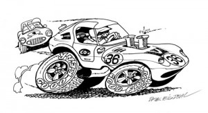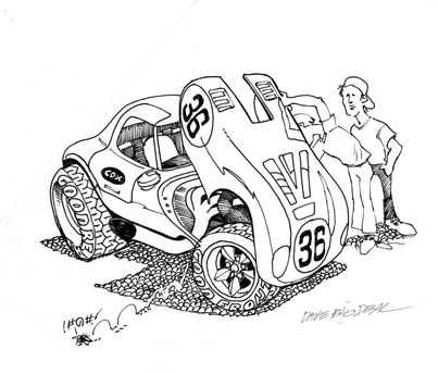 残りの1枚は、ピットストップかパドックでの 『置き』の絵柄 で、Deal’s Wheelsのファニーカーのように、フロントフードをフリップアップして、周囲に人物を描いて欲しいとリクエストしました。
